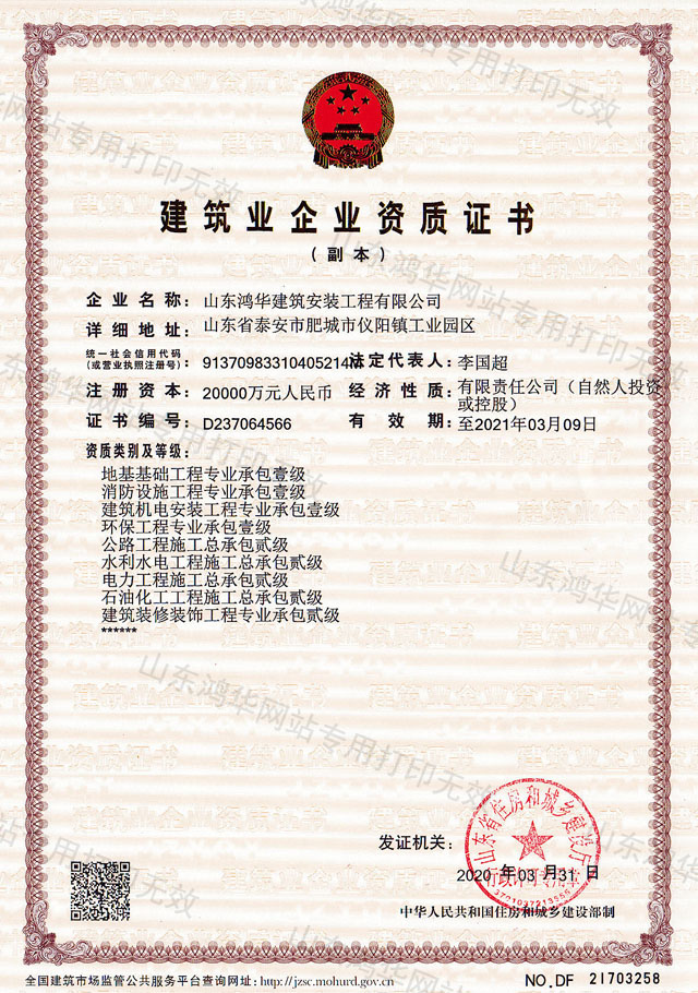 更多信息+山东鸿华建筑安装工程有限公司是一家主要以建筑项目为主的企业;公司有多项资质包括市政公用工程、机电工程、建筑工程施工总承包壹级资质、建筑机电安装...